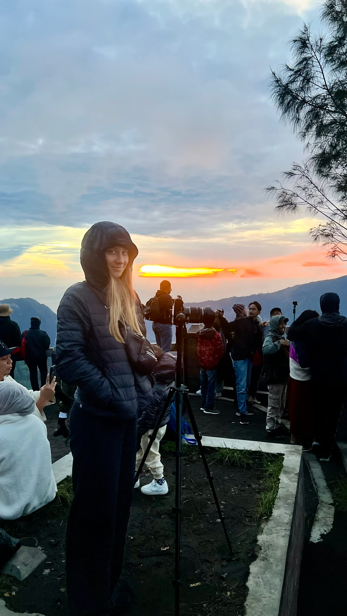 Po zaledwie 4 godzinach snu, o 3:00 w nocy byliśmy już w drodze na punkt widokowy King Kong Hill, z którego planowaliśmy zobaczyć wschód słońca na tle trzech wulkanów. Przed nami było około 4 km marszu w całkowitej ciemności, a drogę oświetlały nam jedynie czołówki. Szliśmy praktycznie sami. Byliśmy jedynymi osobami, które zdecydowały się pokonać tę trasę pieszo. Co chwilę mijały nas jeepy wypełnione turystami, jadące w stronę punktu widokowego. Na miejscu szybko zrobiło się tłoczno. Ludzi przybywało z każdej strony, gwar narastał, a spokojna atmosfera gdzieś zniknęła. Mimo to sam moment wschodu słońca i widok wulkanów wynagrodził cały wysiłek. Z każdą minutą robiło się coraz jaśniej, a około 5:00 zaczęły pojawiać się pierwsze kolory na niebie.