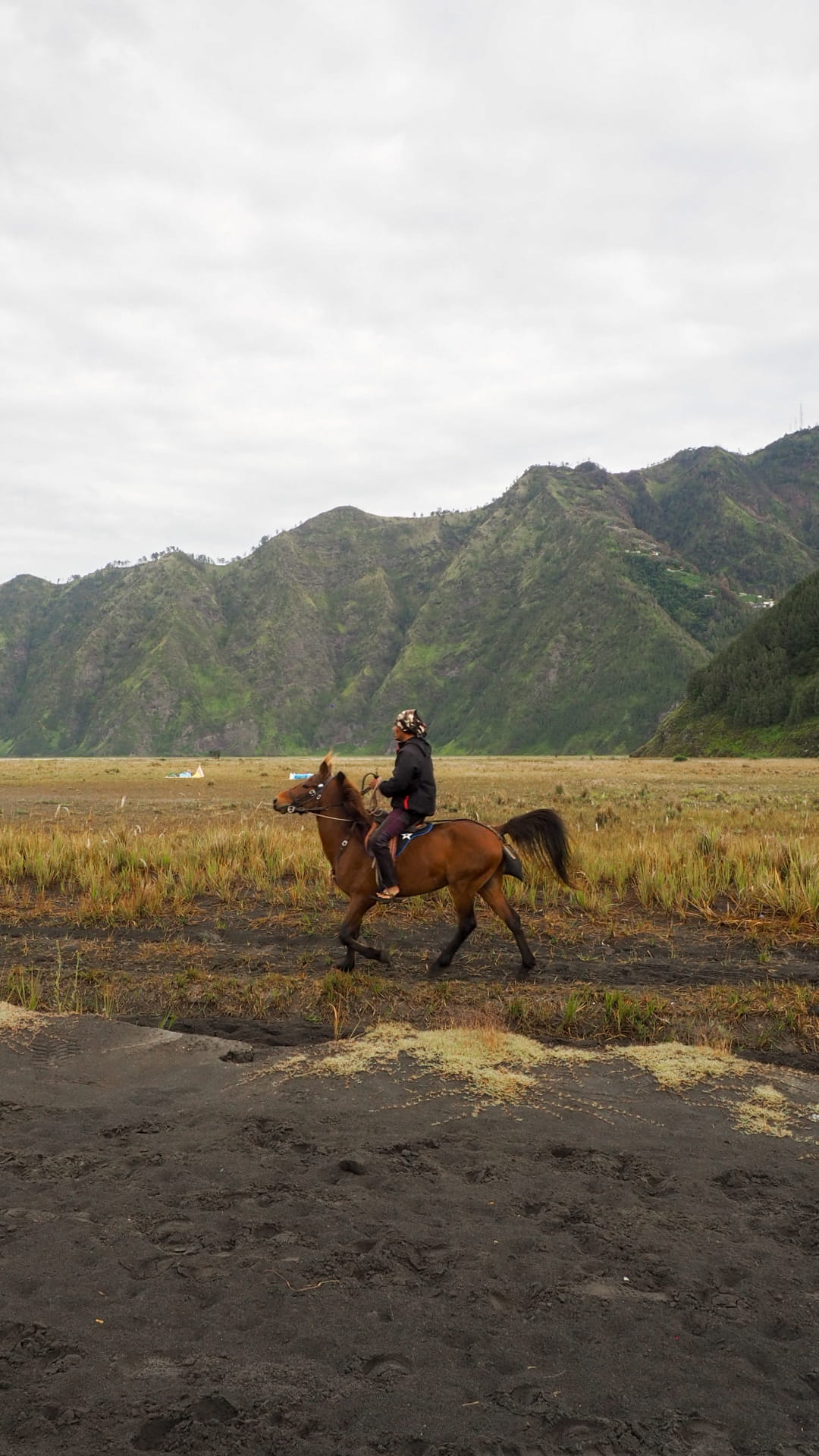 Po powrocie do Cemorolawang ruszyliśmy na tajną ścieżkę, zaczynającą się przy hotelu Camara Indah Hotel (łatwo znaleźć ją na maps.me). Najpierw zeszliśmy w dół ok. 10 minut leśną drogą, a potem przez mniej więcej pół godziny szliśmy przez wulkaniczną kalderę. Ten odcinek zrobił na nas ogromne wrażenie. Szara ziemia, unoszący się pył, ogromna, pusta przestrzeń i odgłosy wulkanów w oddali. Wszystko razem przypominało krajobraz z innej planety. Co jakiś czas przejeżdżały jeepy, a poza nami nie spotkaliśmy nikogo, kto zdecydowałby się iść pieszo. Dopiero bliżej krateru zaczęło pojawiać się więcej turystów.